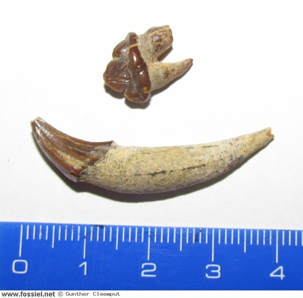 Op de foto staat zowel een voortand (onderste exemplaar) als een kies (bovenste exemplaar) van een zeehond.