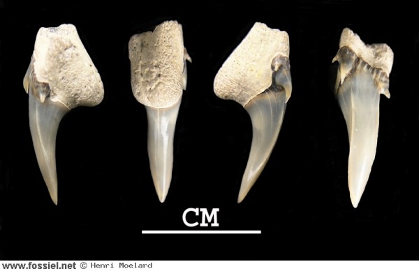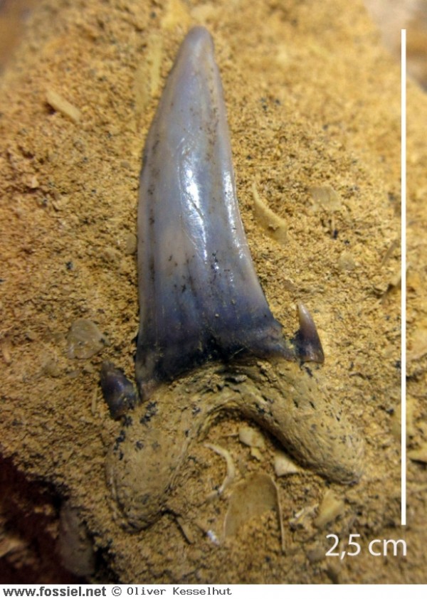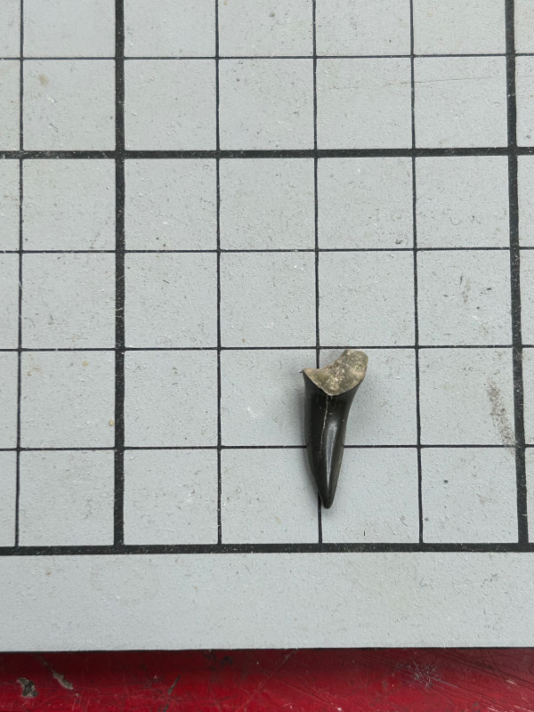 Symphysaire tand. Deze tand vertoont verticale ribbels aan de basis van de kroon, typisch voor juveniele exemplaren van P. bronni. Mogelijk uit Horizont van Romontbos, maar de tand zat in een losliggend brok kalksteen dus kan ook van iets hoger in de stratigrafie zijn geweest.