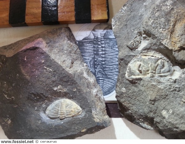 Cephalon en pygidium. Grote phacopid uit de Liten formatie. Kleine cephalon op de foto behoort aan Aulacopleura konincki.