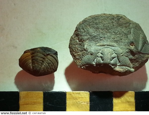 Cranidium en pygidium. Pustulatie kenmerkend voor deze prachtig gedetailleerde soort. Niet veel voorkomend. Rechts naast het cephalon zie je de thorax van de soort Trinucleus reussi. Rokycany bij Dily.