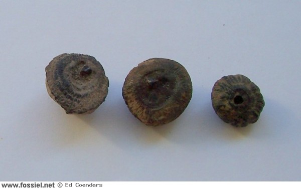 Hier zie je 3 huidstekels van een rog (1-2cm). Deze stekels kunnen in grootte variëren van enkele mm's tot enkele cm's. Soms zie je de eigenlijke stekel nog compleet, maar meestal slechts een fragment of helemaal niets.