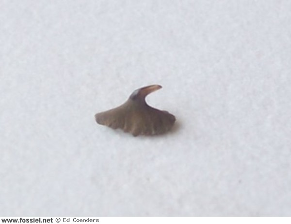 Het betreft hier een complete stekel van een rog. Grootte: 5 mm.