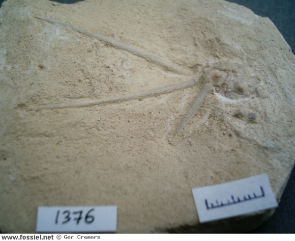Een deel van de corona met drie stekels lagen omgekeerd in een stuk kalksteen. Ik heb er gips opgeschud en van de andere kant uit vrijgeprepareerd, zodat de buitenkant v.d. corona zichtbaar werd. Dus dit fossiel ligt in een blokje gips, dat ik met mergel uit de originele kalk heb bestreken.