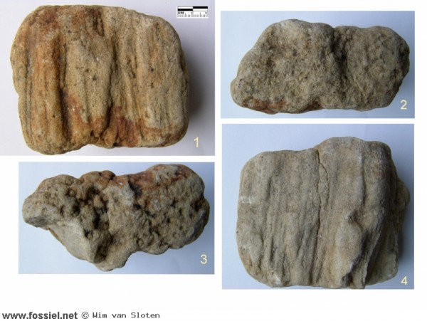 Collage van Skolithos, ook wel buizenzandsteen genoemd. Het bevat sporen van verticale tunnels van ongewervelde dieren (zoals wormen) die zich in het zand ophielden. Foto 1 en 4 laat de zijkanten zien. Foto 2 de bovenkant en 4 de onderkant.