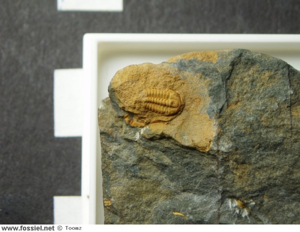 Kleine zeldzame ptychoparide trilobiet. Behoort tot dezelfde familie als Sao hirsuta, Solenopleuridae. Omgeving Skrije.