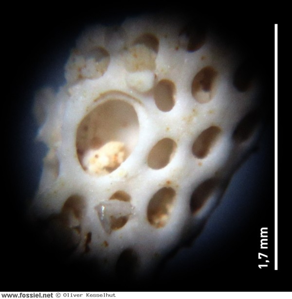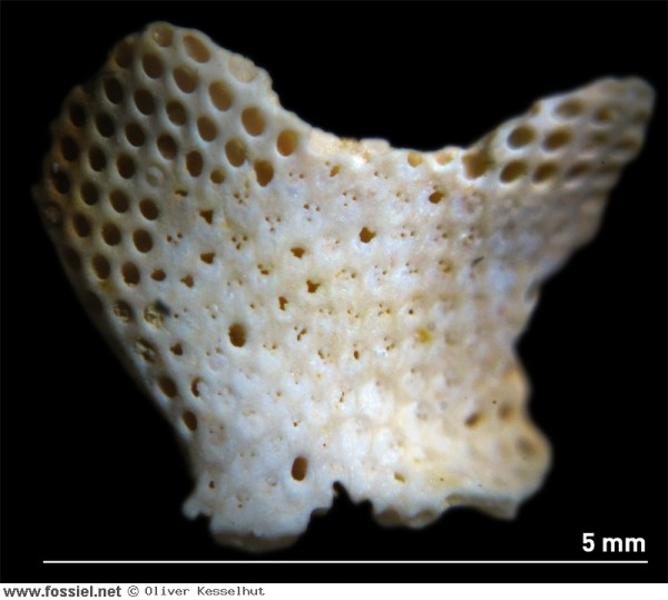 Een bijzonder exemplaar van T. meudonensis dat een heteromorph groeiproces toont. Het distale gedeelte toont de "normale" grote en ronde membranimorphe zooecia. In het middelste gedeelte van de kolonie zijn de mondopeningen door een kalklaagje (lamina) gesloten. Opmerkelijk zijn de drie kleine gaatjes in deze laminae. Een fenomeen dat volgens Voigt (1975) nog niet verklaart kan worden.
