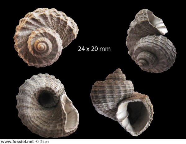 Miste 3. Behoorlijk groot exemplaar. Subsuturale zone niet erg concaaf, tweede generatie spiralen goed herkenbaar, betrekkelijk weinig radiale ribben.