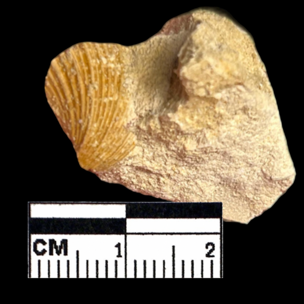 Een bolle klep. Gevonden op de storthoop van groeve Romontbos 24-9-2023. Klein klepje. Slechts een paar centimeter. Helaas is er aan de achterkant geen ondersteundende matrix, waardoor hij niet verder geprepareerd kan worden.