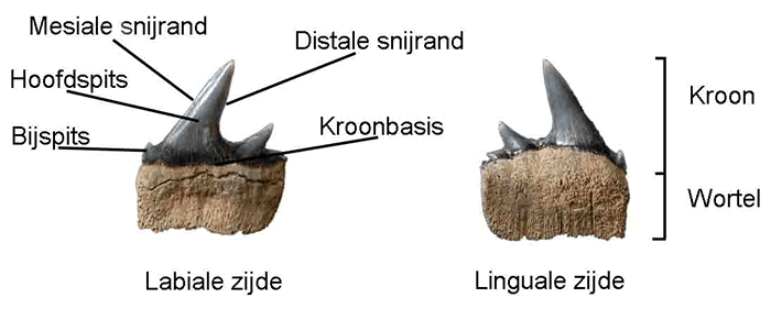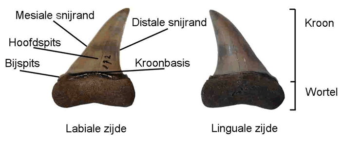 Gebruikte terminologie bij haaientanden. Dit is een Notorynchus sp.