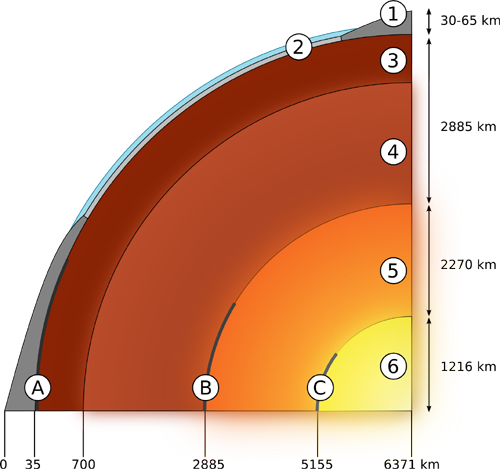 Een schematische weergaven van de binnenkant van de Aarde. 1. Continentale korst, 2 oceanische korst, 3 en 4 aardmantel, 5 buitenkern (vloeibaar), 6 binnenkern (vast), A Mohorovičić discontinuiteit, B Gutenberg discontinuïteit, C Lehmann discontinuïteit. Creative Commons licentie.