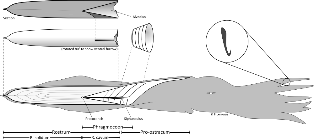 Schematische reconstructie met voornaamste onderdelen van een belemniet
