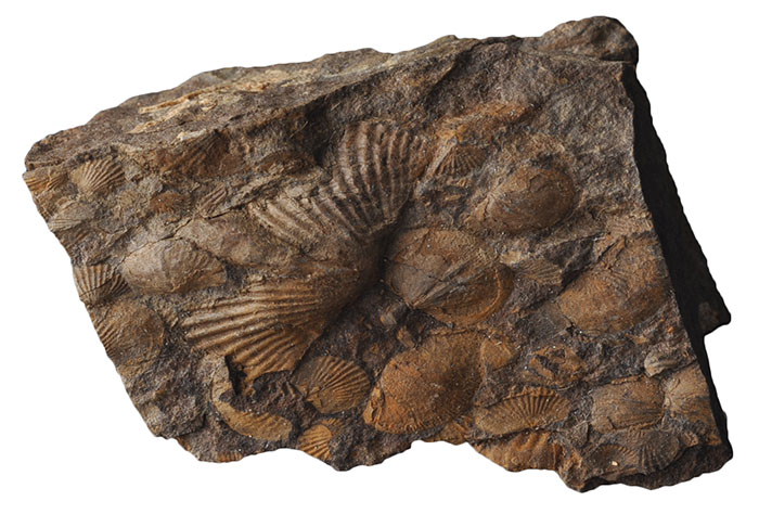 Stukje zeebodem uit het onder-Devoon van België met verschillende soorten brachiopoden die als steenkern bewaard zijn gebleven.