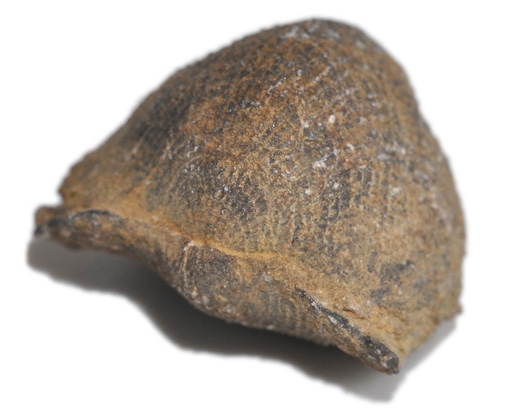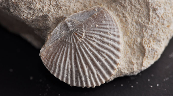 Voorbeeld van een brachiopode uit het boven-Krijt van België. De schelp is symetrisch, maar de twee schelphelften niet.