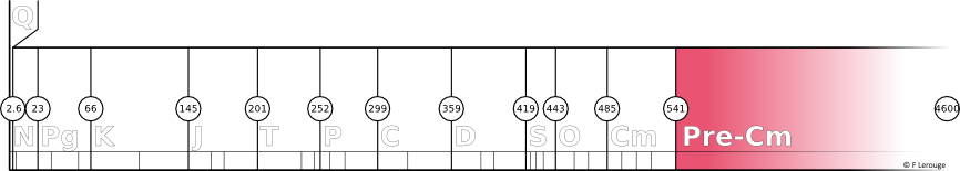 Situering van het Precambrium in de geologische tijdschaal (niet op schaal)
