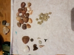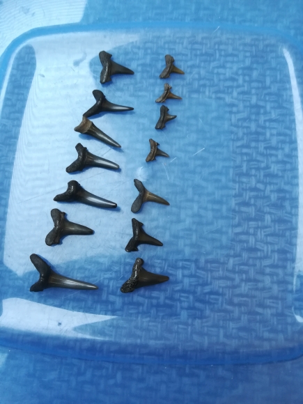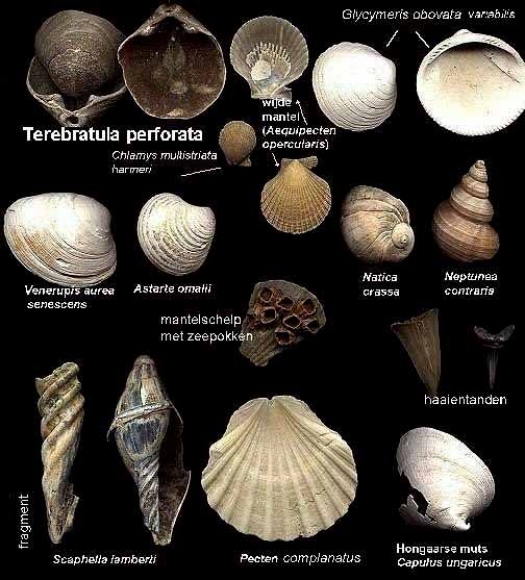 Bivalven, haaientanden en roggentanden komen het meeste voor. Ook kunnen tanden worden gevonden van vissen en potvissen en zelfs diverse botten van zoogdieren. De vondsten zijn grotendeels afkomstig uit het Mioceen, Plioceen tot en met Pleistoceen (onderdeel van het Neogeen tijdperk). Vogelbotjes (herkenbaar aan het feit dat ze hol zijn) zijn erg zeldzaam.