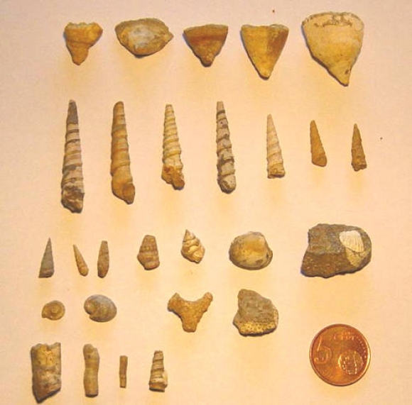 De vondsten bestaan voornamelijk uit langwerpige gastropoden, bivalven en hout fragmenten. Koralen, sponzen en serpuliden komen ook voor.