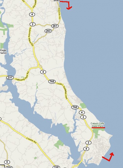 De Calvert cliffs liggen ten zuidoosten van Washington in de staat Maryland aan de Chesapeake Bay. De Calvert Cliffs zijn ongeveer 35 kilometer lang, en strekken zich uit vanaf de Chesapeake Bay tot aan Drum Point aan de westkust van Maryland. Op diverse plekken kan men naar beneden gaan om fossielen te zoeken tussen de stenen op het strand. Ook kan gezeefd worden. Neem hiervoor een schep en een zeef mee. Op sommige plekken gelden zoekverboden in de klif of moet betaald worden voor toegang tot het strand.
