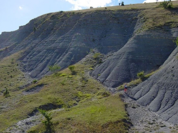 Op het laatste stukje pad naar deze heuvel toe zie je keien liggen in het pad waarin de belemnieten duidelijk zichtbaar zijn. Bij de heuvel zelf liggen aan de voet diverse kleine ammonieten en stukjes belemniet. Ook kan je hier gastropoden vinden en stukken ammoniet doorweven met kwarts. Rechts van de heuvel en op de heuvel zelf staat een licht vervallen hekwerk waarachter je mooie ammonieten kan vinden. We hebben daar stukken gevonden van windingen van zeker 6 cm. breed wat dus aangeeft hoe groot de ammoniet zelf geweest moet zijn. Rechts van de heuvel liggen een soort stromen van geërodeerd sediment waar op de oppervlakte ervan ammonieten en belemniet te vinden zijn. Er zal onder de oppervlakte ook het nodige te vinden zijn. De fossielen in het erosiepuin zijn eenvoudig bij elkaar te rapen. Het verdient aanbeveling doosjes of potten bij je te hebben omdat de fossielen wel erg bros zijn.